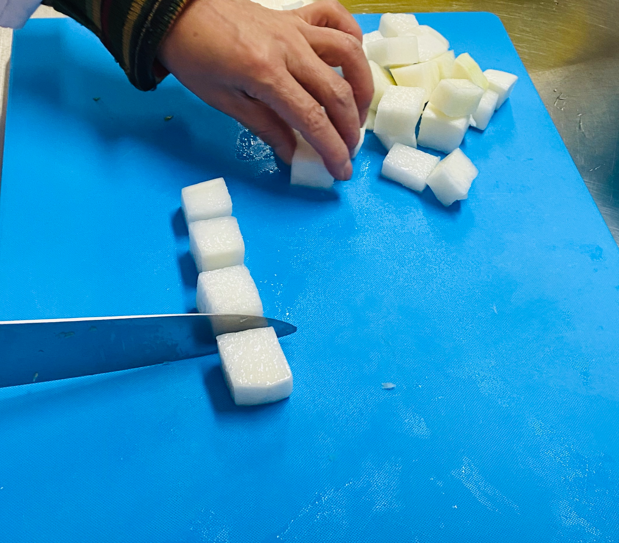 1. 무는 깨끗이 씻어 2.5 X 2.5cm크기로 깍둑 썰기합니다.