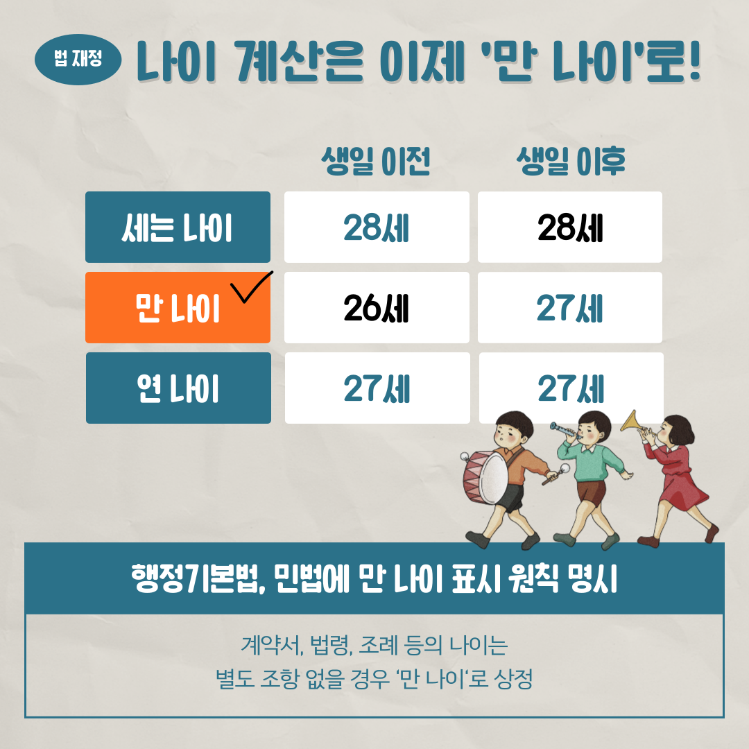 2023.06.28(수) 부터 만나이 통일법 시행으로 전국민이 1-2살이 어려지게 된다. 법적, 사회적 나이를 통일하는 내용의 개정 행정기본법과 민법이 시행되기 때문이다. 만나이계산법과 적용범위에 대해서 알아보자.