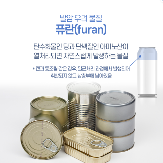 캔 음료에는 발암 우려 물질인 퓨란이 들어있다. 식품의 주성분 중에서 탄수화물인 당과 단백질인 아미노산이 열처리되면 자연스럽게 발생하는 것이 바로 퓨란이다. 퓨란은 휘발성이 강해, 다른 식품의 경우 쉽게 휘발되지만 캔과 통조림 같은 경우에는 멸균처리 과정에서 발생되어 휘발되지 않고 상층부에 남아있게 된다. 퓨란은 무색의 휘발성 액체로 탄소 4개, 산소1개, 수소 4개로 이루어져 있다. 퓨란의 끓는 점은 31℃로 끓는 점이 낮아 쉽게 휘발된느 특성을 가지고 있다. 실제로 퓨란은 동물실험에서 암을 유발하는 것으로 밝혀졌지만 사람에게는 아직 확인되지 않은 잠재적인 발암물질이다. 국제 암 연구센터(IARC)에서는 퓨란을 잠재적인 발암물질인 "Group 2B"로 분류했다.