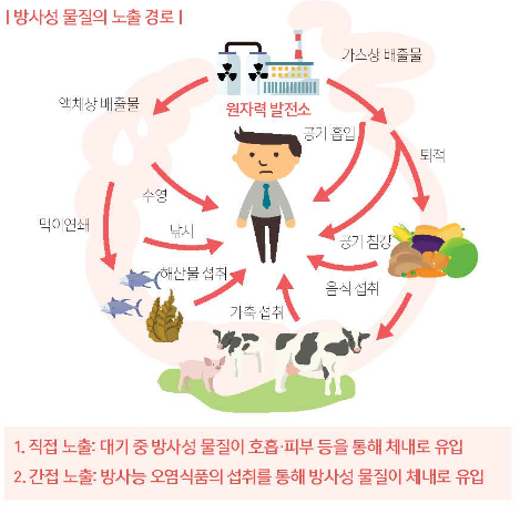 원자력 발전소 등의 사고로 대기에 방출된 방사성 물질의 인체노출 경로는 다음과 같다.