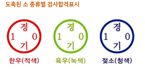 국내산 쇠고기(수입산 소를 국내에서 6개월 이상 사육하고 도축한 쇠고기는 국내산으로 구분) : 한우고기는 우리나라 순수 한우(누렁소)에서 생산되는 고기이다. 육우고기는 육용종, 교잡종, 젖소 수소 및 송아지를 낳은 경험이 없는 젖소 암소에서 생산되는 고기를 말한다. 젖소고기는 송아지를 낳은 경험이 있는 젖소 암소에서 생산되는 고기를 말한다. 수입산 쇠고기(수입산 소를 국내에서 6개월 미만으로 사육하고 도축한 쇠고기는 수입산으로 구분) : 수입 쇠고기는 외국에서 수입되는 고기를 말한다.