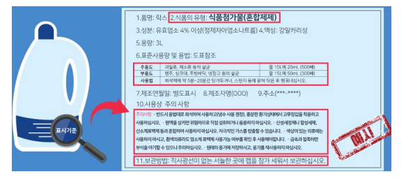 ○ 제품 표시사항 확인 : 식품첨가물 또는 혼합제제 표시 확인, 제품명, 업소명, 제조 연월일, 내용량, 원료명, 성분명, 보관방법, 사용기준, 주의사항 등을 반드시 확인