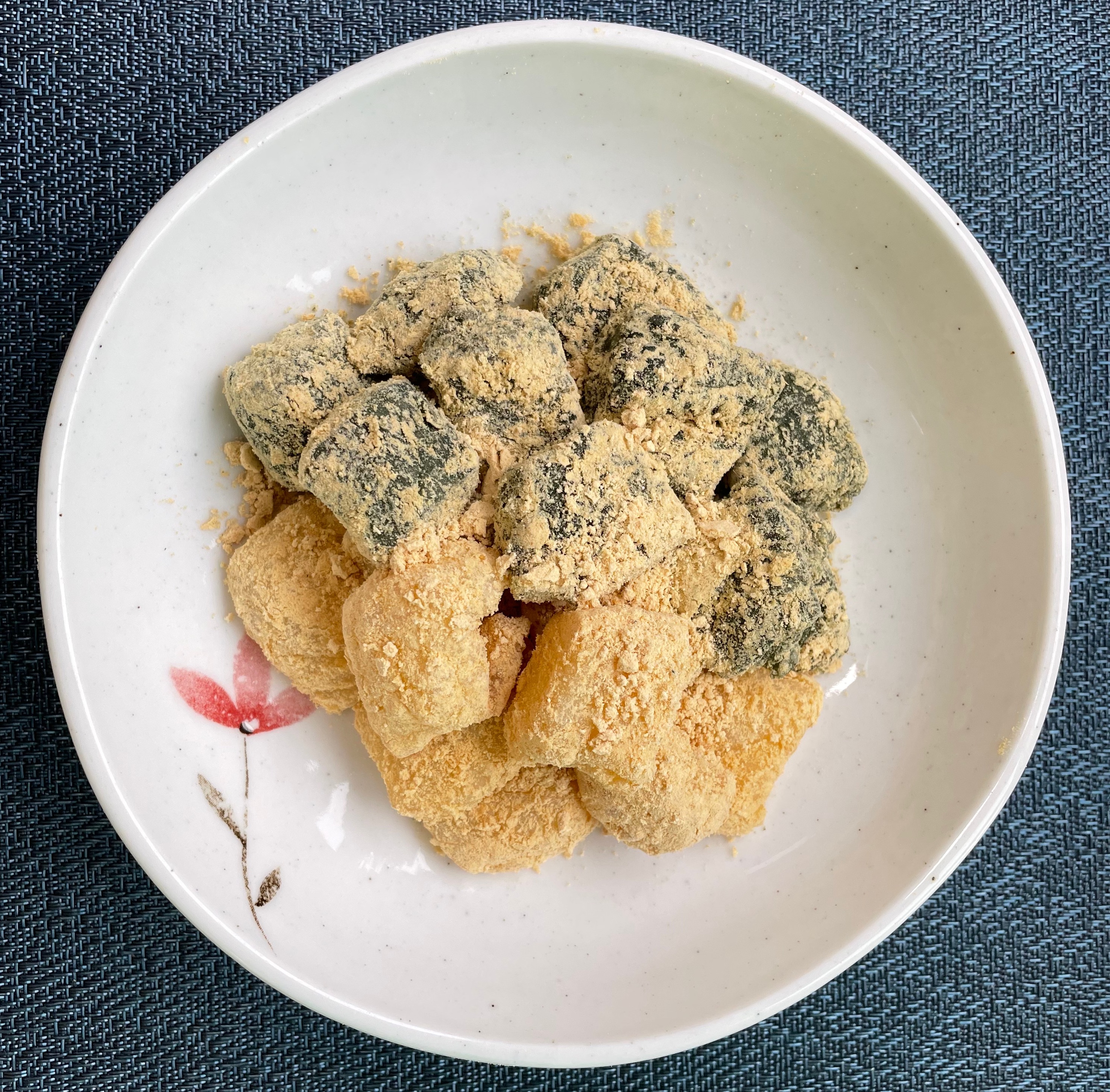 4. 넓은 판에 콩가루 절반을 깐 다음 찧어놓은 떡을 올리고 그 위에 나머지 콩가루를 뿌려요.