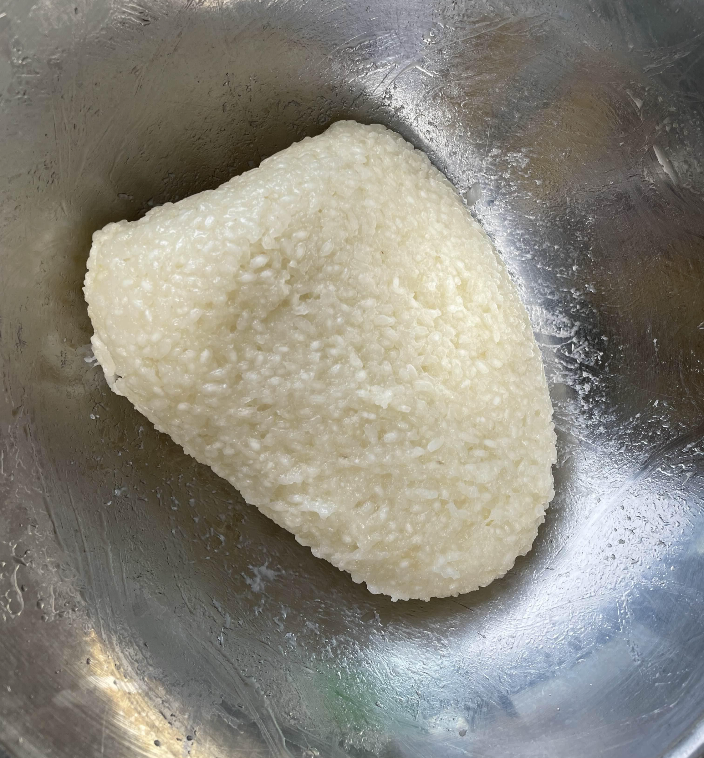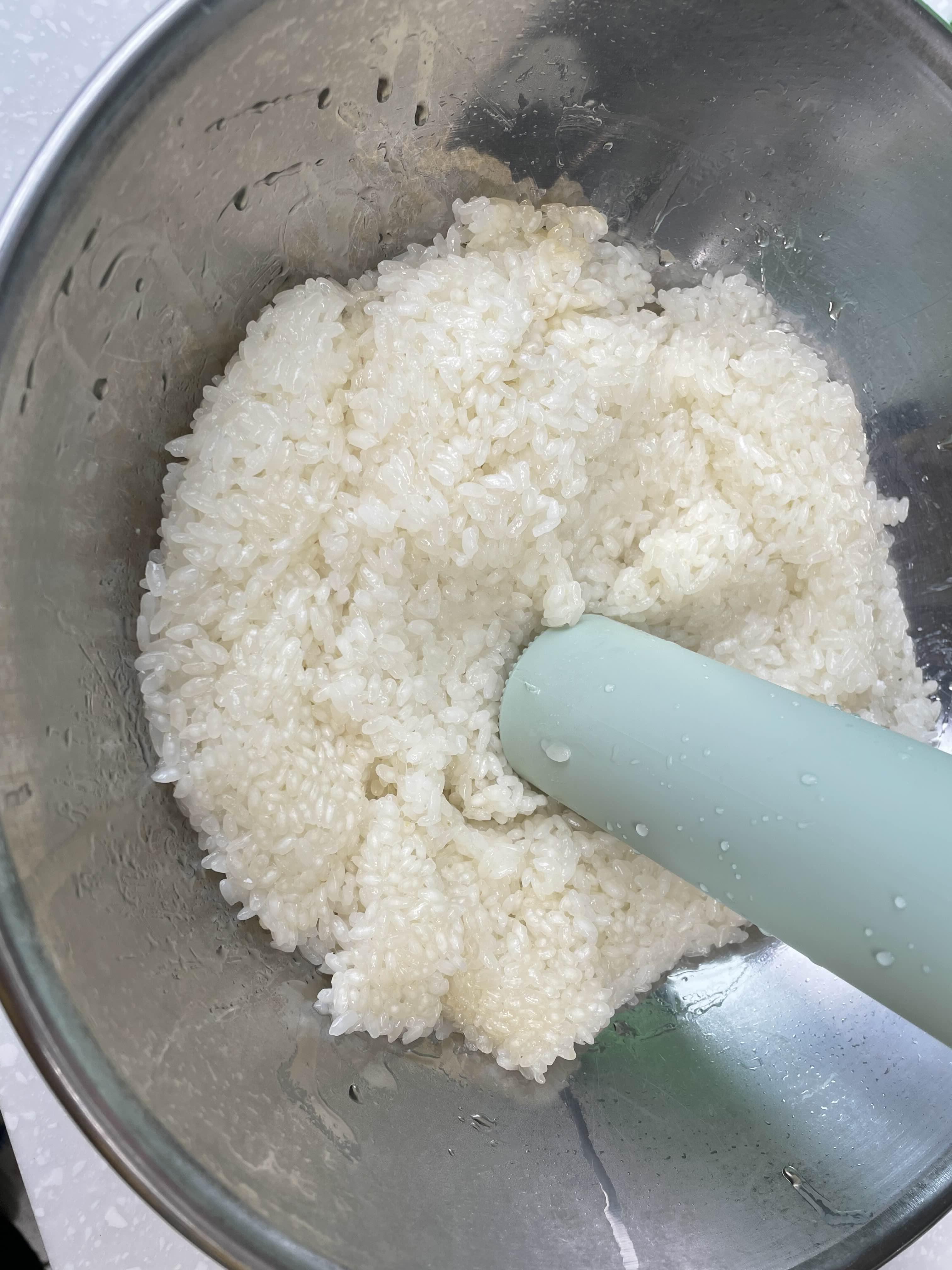 3. 볼과 방망이에 참기름을 발라준 후 다 지은 찹쌀밥을 넣고 두드려줘요.